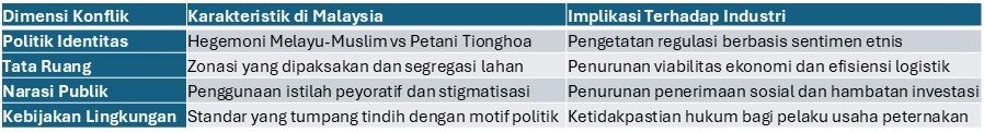 Ketegangan ini menunjukkan bahwa peternakan babi di Malaysia melampaui batasan agrikultur murni, menjadi situs konflik komunal yang mencerminkan disjungsi sosial-budaya antara dua kelompok etnis terbesar di negara tersebut.