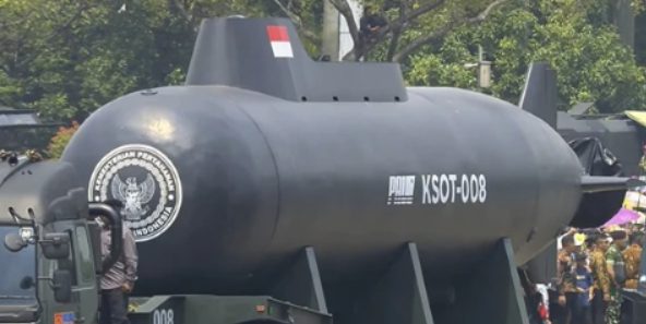 "Kapal selam otonom tanpa awak KSOT merupakan hasil karya anak bangsa produksi PT PAL," ujar narator saat memperkenalkan kapal tersebut di tengah parade militer.