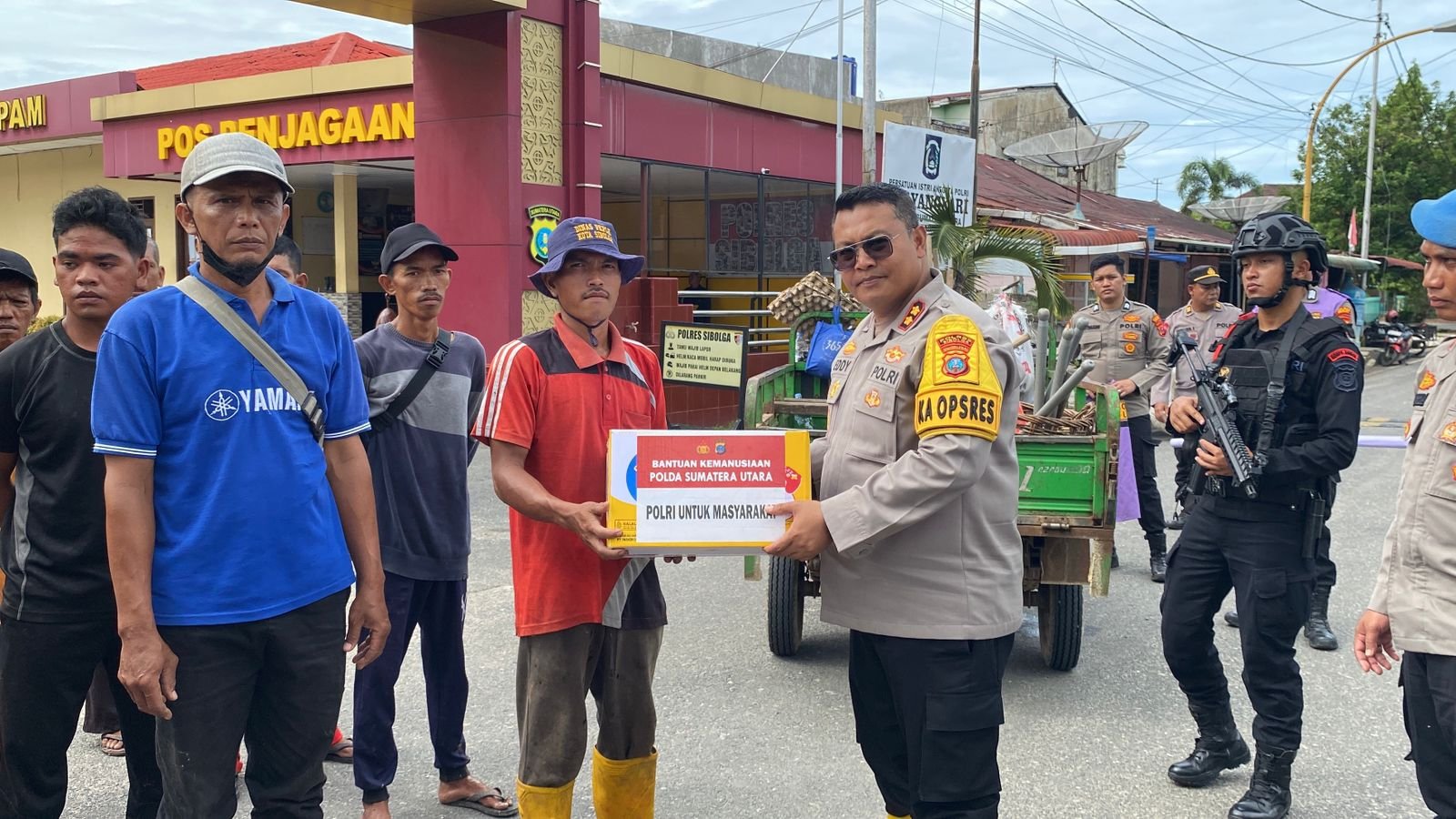 Polres Sibolga menyalurkan bansos bagi warga terdampak bencana banjir dan tanah longsor di depan Polres Sibolga, Kelurahan Kota Baringin, Kecamatan Sibolga Kota, Sabtu pagi (13/12). (foto: Ist/BITV)