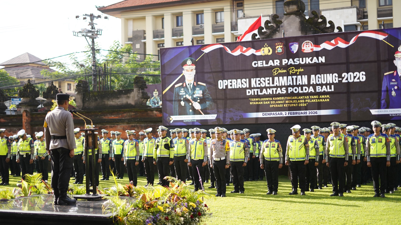 Irwasda Polda Bali, Kombes Pol Asep Ahdiatna, S.I.K., M.H., memimpin Apel gelar pasukan memulai Operasi Keselamatan Agung 2026, Senin (2/2/2026), di halaman Mako Polda Bali. (foto: Ist/BITV)