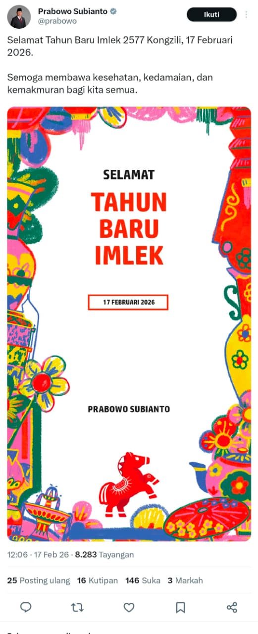 Ucapan tersebut disampaikan Prabowo melalui akun X pribadinya, @prabowo, dengan menulis: "Selamat Tahun Baru Imlek 2577 Kongzili, 17 Februari 2026.