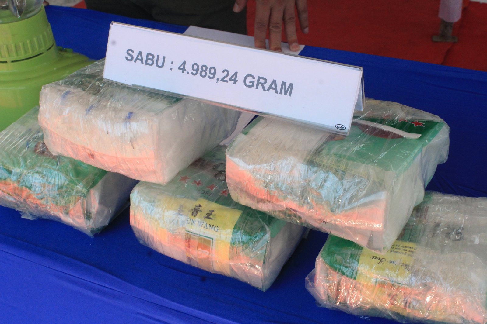 Dari hasil penggeledahan, petugas menemukan lima paket sabu yang dikemas dalam plastik teh bertuliskan "Refined Chinese Tea" di dalam tas belanja.