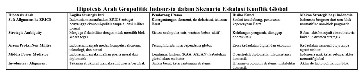 Hipotesis mengenai arah geopolitik Indonesia dalam skenario eskalasi perang global disusun bukan sebagai prediksi deterministik, melainkan sebagai kemungkinan-kemungkinan rasional (plausible futures) yang lahir dari interaksi antara struktur sistem internasional, warisan historis politik luar negeri Indonesia, serta dinamika kekuatan besar kontemporer.