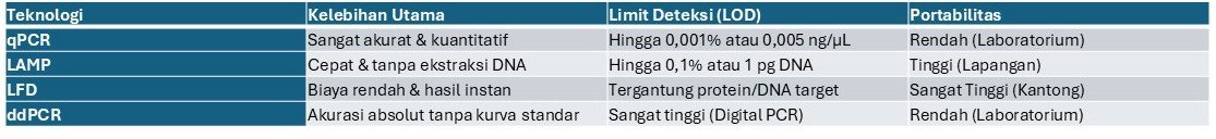 1. Quantitative Real-Time PCR (qPCR): Metode ini tetap menjadi standar emas dalam autentikasi halal karena sensitivitasnya yang tinggi dan kemampuannya untuk memberikan estimasi kuantitatif. Penggunaan probe spesifik seperti TaqMan memungkinkan deteksi DNA babi bahkan pada konsentrasi serendah 0,005 ng/µL dalam campuran gelatin. 2. Loop-mediated Isothermal Amplification (LAMP): Sebagai alternatif yang lebih portabel, LAMP memungkinkan amplifikasi DNA pada suhu konstan tanpa memerlukan mesin thermal cycler. Metode ini sangat ideal untuk pengujian lapangan di rumah potong hewan atau pelabuhan karena hasilnya dapat dianalisis dengan mata telanjang melalui perubahan warna. 3. Lateral Flow Devices (LFD): Menggunakan prinsip yang mirip dengan tes kehamilan, LFD menawarkan cara yang sangat cepat dan murah untuk skrining awal. Meskipun memiliki keterbatasan dalam hal sensitivitas dibandingkan PCR, alat ini sangat berguna untuk inspeksi mendadak di restoran atau supermarket. 4. Biosensor Berbasis Nanopartikel: Integrasi partikel emas (gold nanoparticles) meningkatkan visibilitas hasil pada perangkat deteksi, memungkinkan identifikasi spesies secara visual dengan tingkat reproduksibilitas yang sangat baik.