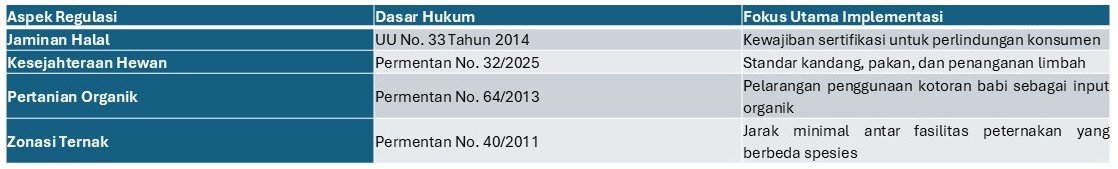Sektor peternakan babi di Indonesia beroperasi dalam sebuah kerangka hukum yang mencoba menyeimbangkan hak ekonomi pelaku usaha dengan sensitivitas mayoritas Muslim serta standar keamanan lingkungan.