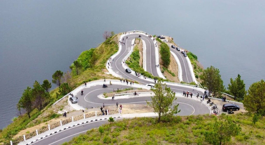 Destinasi ini terkenal dengan jalan berliku yang menghadap langsung ke Danau Toba.