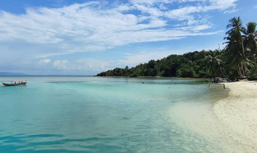 Pulau tak berpenghuni ini menawarkan pasir putih halus dan air laut jernih bergradasi biru kehijauan.
