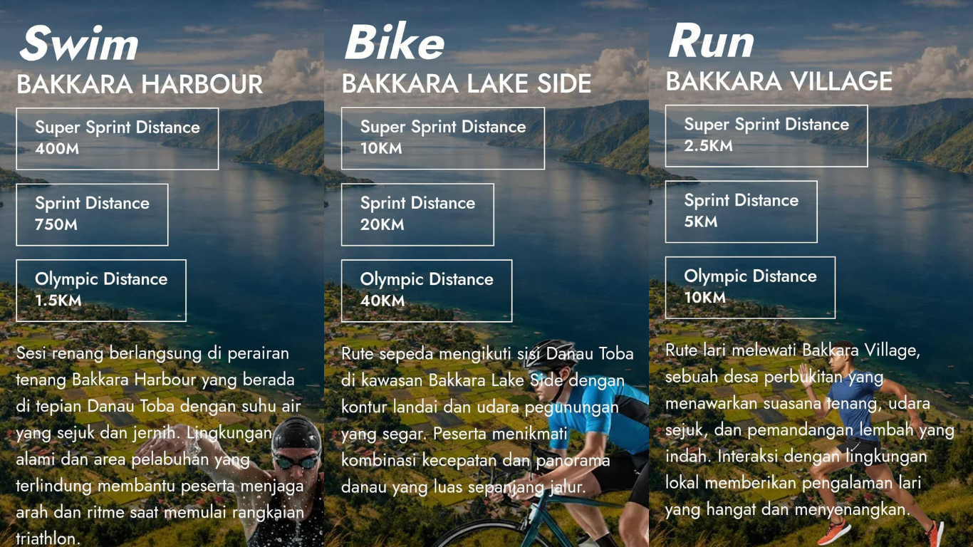 Event ini mengajak para atlet dan penggemar olahraga untuk merasakan sensasi triathlon di dataran tinggi Humbang Hasundutan dengan ketinggian sekitar 900 hingga 2.200 meter di atas permukaan laut.Baca Juga: