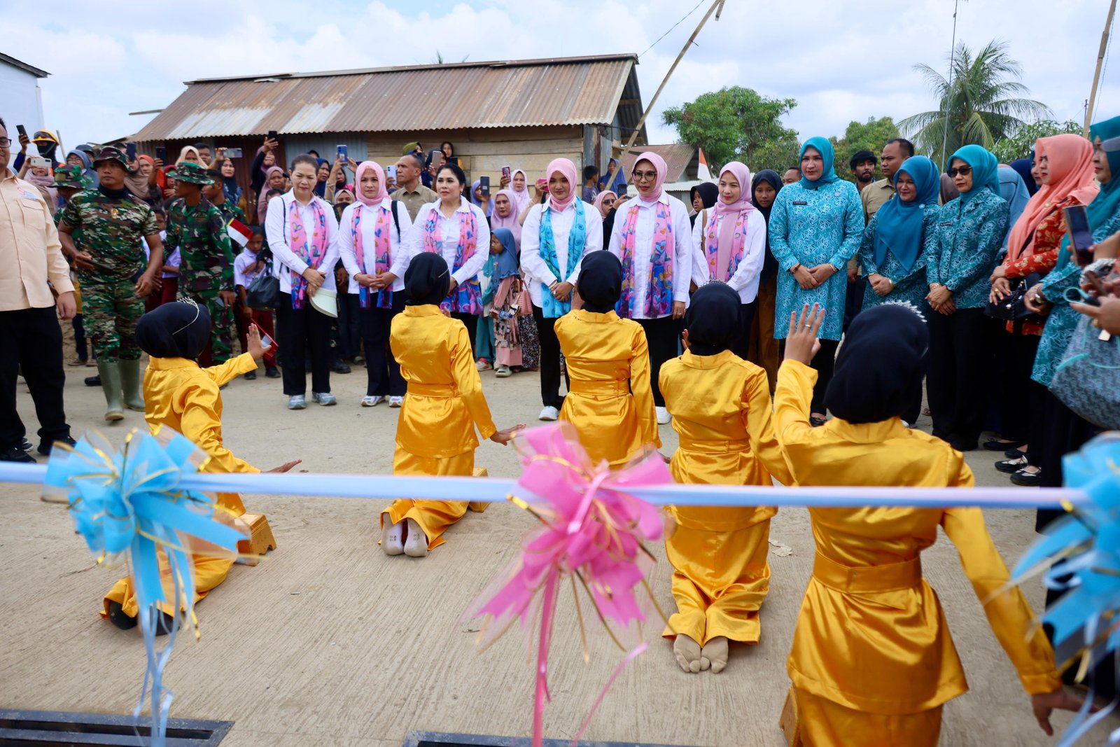 Ketua TP PKK Aceh, Marlina Muzakir, mendampingi pengurus Seruni KMP meresmikan penggunaan kembali SD Negeri 1 Sungai Liput, Kec. Kejuruan Muda, Kab. Aceh Tamiang, Kamis, 12 Februari 2016. (foto: Ist/BITV)