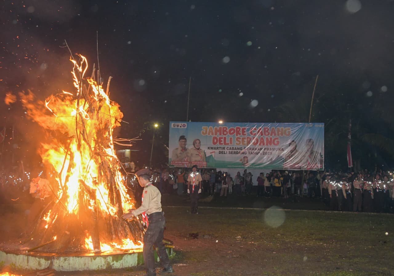 DELI SERDANG – Malam penutupan Jambore Kwartir Cabang (Kwarcab) Gerakan Pramuka Deli Serdang Tahun 2025 diwarnai api unggun yang membakar semangat persatuan dan ketekunan para anggota Pramuka.