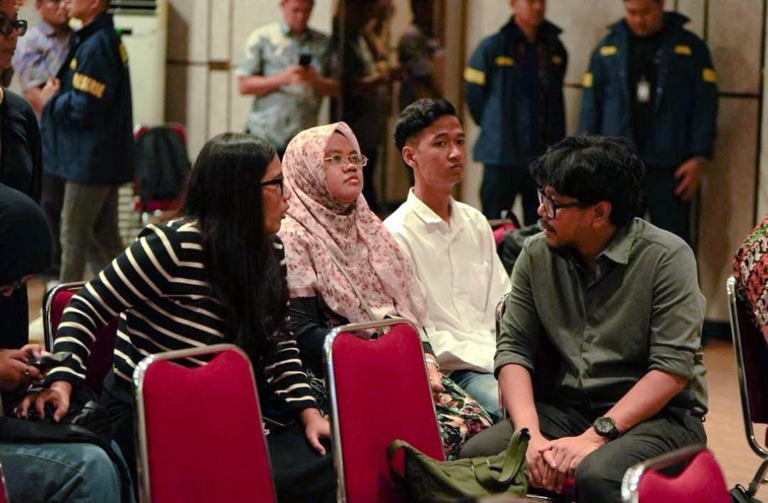 Mereka duduk di belakang awak media, didampingi pegiat sosial dan hak asasi, termasuk dari Komisi untuk Orang Hilang dan Korban Tindak Kekerasan (KontraS) serta aktivis media sosial Ferry Irwandi.