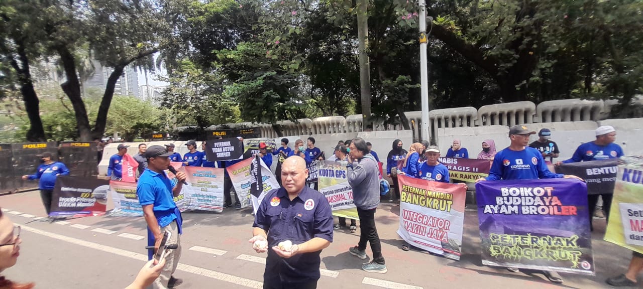 Sebagai bentuk protes simbolik, para peternak juga membagikan 1.500 ekor anak ayam (DOC) kepada masyarakat yang melintas di sekitar Monas.