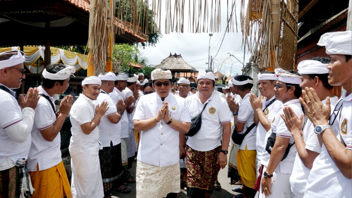 BADUNG — Wakil Gubernur Bali, I Nyoman Giri Prasta, hadir dalam rangkaian upacara Ngenteg Linggih, Padudusan Alit, Mupuk Pedagingan, dan Caru Wraspati Kalpa di Pura Ibu Pasek Gelgel, Banjar Sawangan, Desa Adat Pemiga, Kelurahan Benoa, Kuta Selatan, Badung, Rabu (3/12).